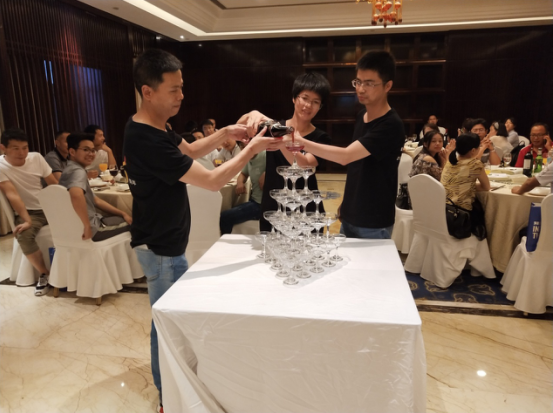 緊接著由金辰軟件合伙人倪小紅女士、李家駒先生和李總一起手捧巨大香檳,向香檳酒塔倒入這15年的美好回憶。晶瑩剔透的香檳酒塔,象征著15年來與客戶共建的累累碩果,層層塔尖象征著一個公司的前進階梯,大家舉起了手中的酒杯,