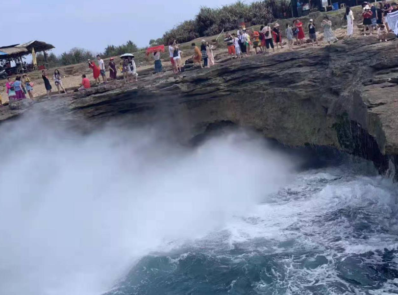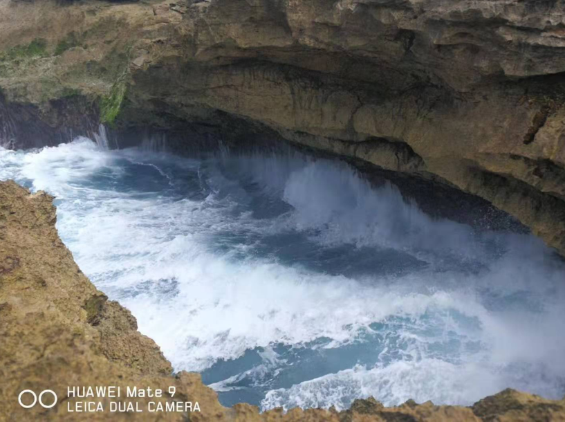 惡魔的眼淚是一個(gè)小的懸崖,但因?yàn)槌D甑暮K疀_刷,形成了一個(gè)開(kāi)口圓形的形狀。懸崖底端也有被海水沖刷出的洞穴,因?yàn)閴簭?qiáng)的擠壓,漲潮的時(shí)候海浪在這里被沖出幾十米高。我們運(yùn)氣很好看到在陽(yáng)光折射下水霧中的彩虹,而且還拍了不少美麗的照片。