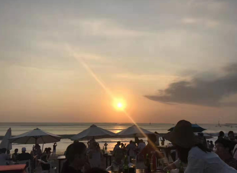 最后一站仍是海邊,而且,是擁有全球十大最美落日之一的金巴蘭海灘。傍晚的金巴蘭,夕陽(yáng)斜斜地掛在海天一線(xiàn)的地方,云層和海水被染得金黃,一層層地變換著顏色,滿(mǎn)目金黃,即使是不太感性的我也為之驚嘆不已。右前方的海灘上,一條機(jī)場(chǎng)跑道筆直延伸入海,銀色的飛機(jī)不斷起降,在斜陽(yáng)的照耀下劃出一道道美麗的弧線(xiàn)。沙灘上,一桌桌的盛宴已經(jīng)一字排開(kāi),就等著我們入席了。當(dāng)晚恰逢我們家駒哥哥的生日,同事們紛紛為他送上祝福。燭光搖曳,海風(fēng)輕柔地?fù)崤骖a,靜靜地,看夕陽(yáng)一點(diǎn)點(diǎn)地落入海中,此時(shí)此刻,吃什么已不再重要。難忘的,最是那一抹夕陽(yáng)醉了的溫柔。